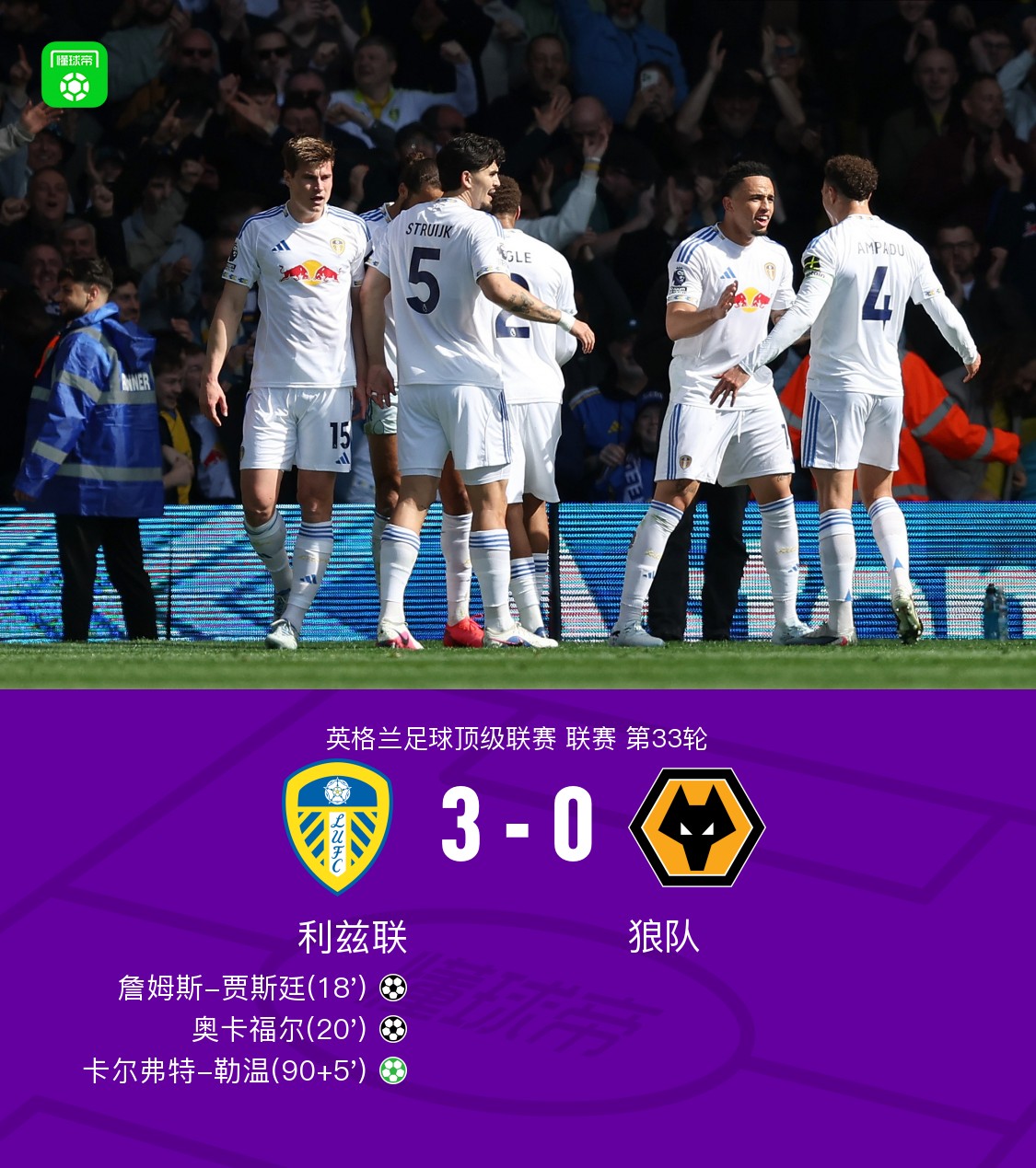 利兹联3-0狼队五轮不败,利兹联一分钟两球,奥卡福尔传射建功