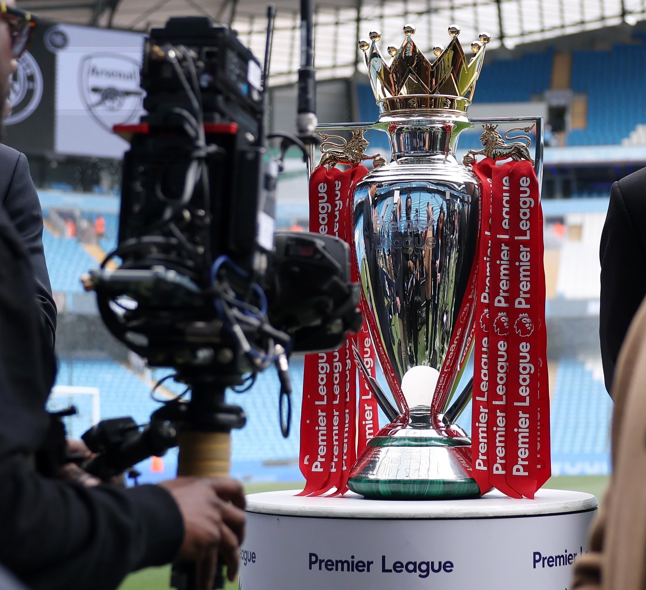 在英超第33轮曼城主场对阵阿森纳的赛前,英超冠军奖杯被带到了阿提哈德球场参与官方拍摄。