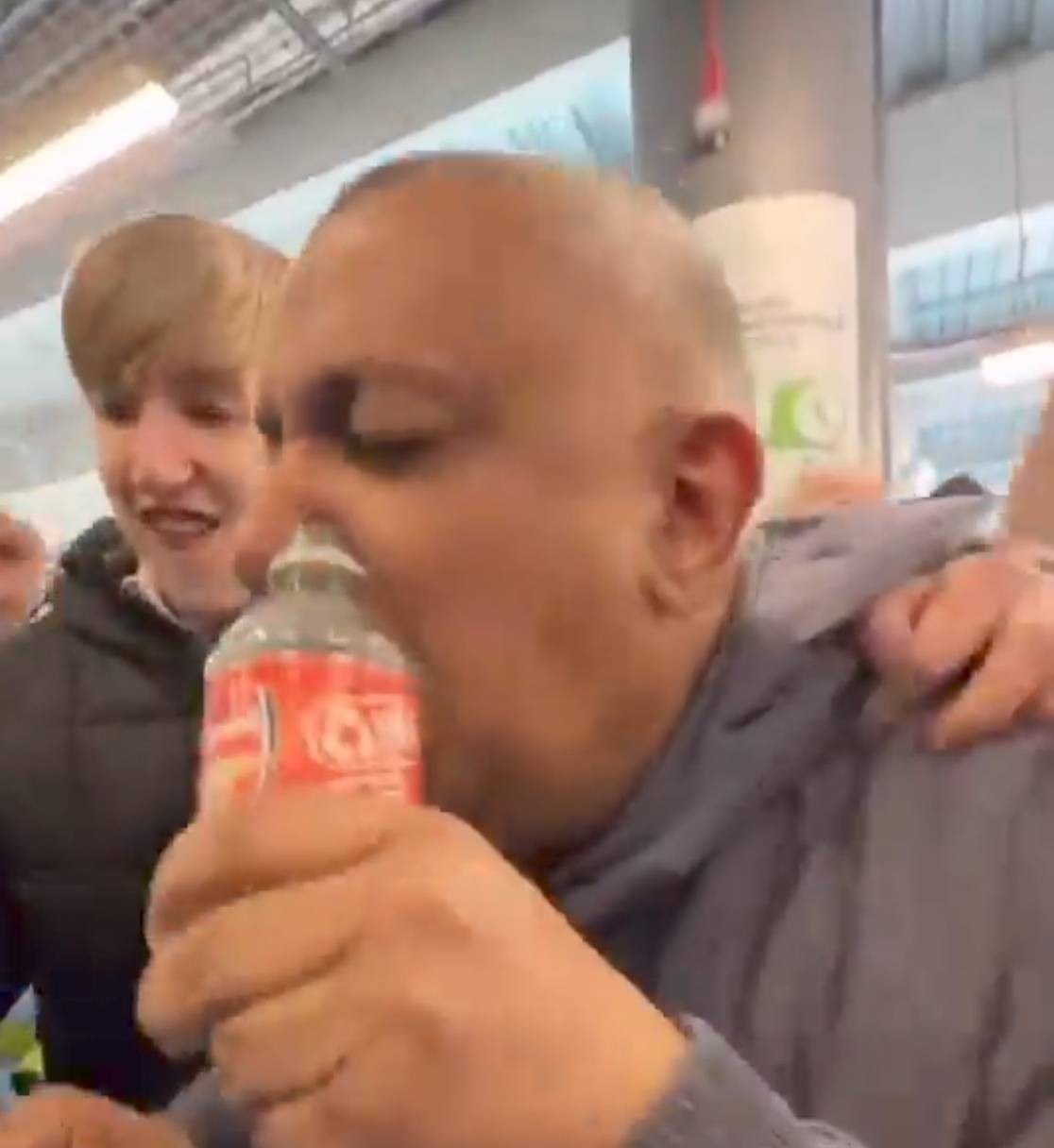 水瓶哥是在“双蓝会”中爆火的——在曼城对阵切尔西的比赛中,多库帮助曼城3-0领先切尔西。大比分领先后,镜头给到了狂欢的曼城球迷,一位曼城球迷拿起了印有阿森纳队徽的红色瓶子,做出了对瓶吹的动作,似乎是认准了曼城会“吃定阿森纳”。超强的“镜头感”让他一夜爆红。