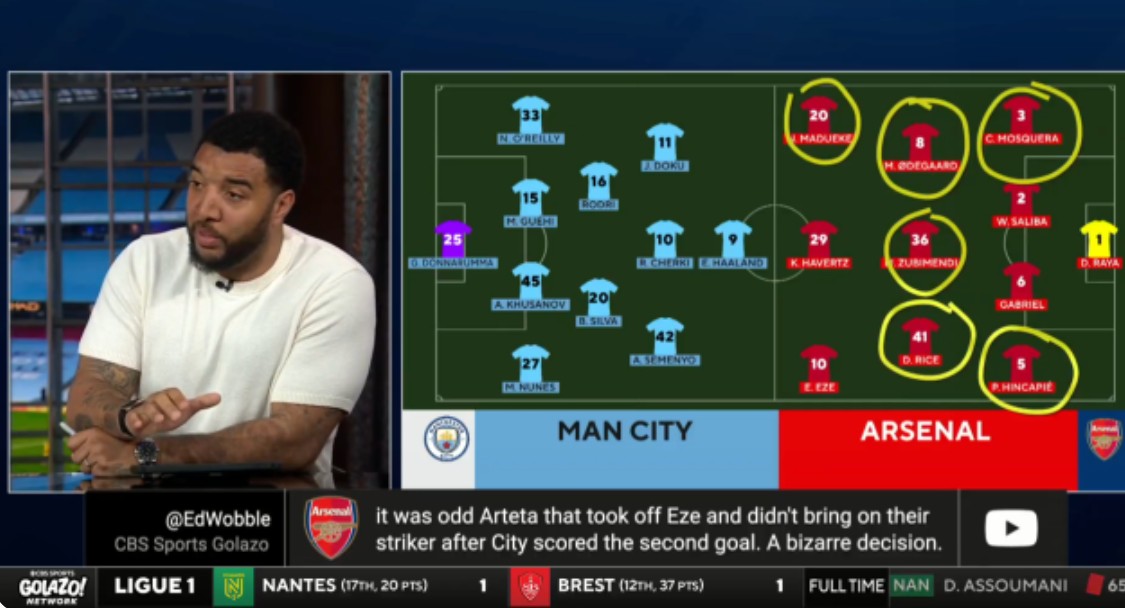 前沃特福德队长在CBS体育直播间点评阿森纳表现时表示,枪手客战曼城的首发阵容中,多达六人未能达到应有水准。